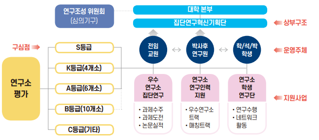 인천대학교는 연구 중심대학으로의 전환을 목표로, 대형과제 수주 실적 개선 및 연구성과의 질적 향상을 위해 우수 연구소에 소속된 연구그룹을 대상으로 연구과제를 지원하고 있습니다. 최대 100명의 전임교원이 10개의 연구 그룹에서 전문분야를 분담하여 다양한 주제의 연구를 진행함으로써 더 넓은 연구를 실현하고,연구결과를 바탕으로 다시 다양한 과제에 도전 및 수주함으로써 지속적인 연구의 선순환을 통한 더 깊은 연구를 실행하는 데에 목적을 두고 있습니다.