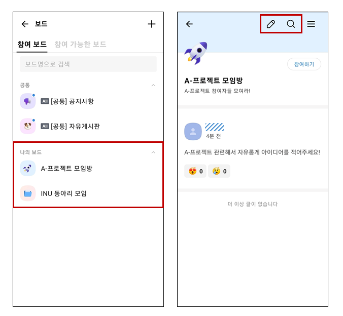 동아리, 프로젝트 등 그룹 활동을 위한 워크보드(피드형 게시판)를 생성하고 운영할 수 있습니다. 생성된 워크보드에서 자료를 공유하고 멘션, 검색, 알림 기능을 제공하여 멤버들 간에 효율적인 협업이 가능합니다.