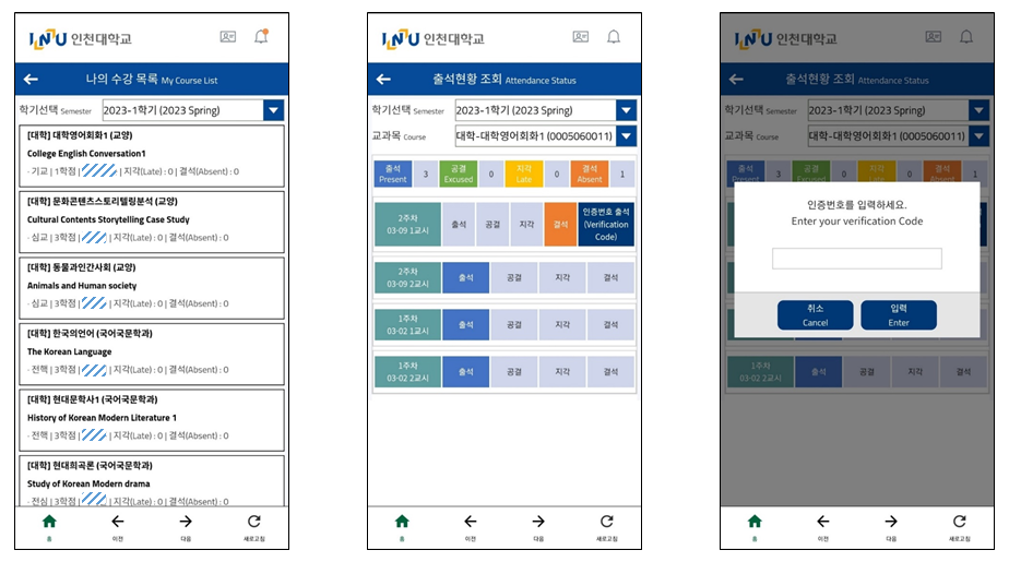 스마트캠퍼스 스마트 출결 메뉴에서 나의 수강 목록, 출석 현황을 확인할 수 있습니다. 수업 담당 교수가 인증번호 출결을 요청할 경우 안내받은 인증번호를 입력하면 교시별로 자동으로 출석 처리가 됩니다. 서비스 대상 학생 주요 기능 이번 학기 나의 수강 목록 제공 강좌별로 출석, 결석, 지각, 공결 정보 제공 자동출결(인증번호) 교시별로 수업 담당 교수가 안내해준 인증번호를 입력하여 출석 처리